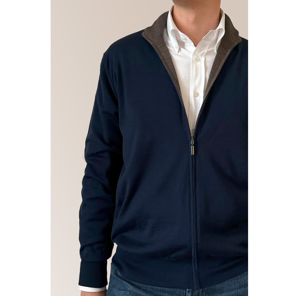 Blue and brown reversible cardigan.